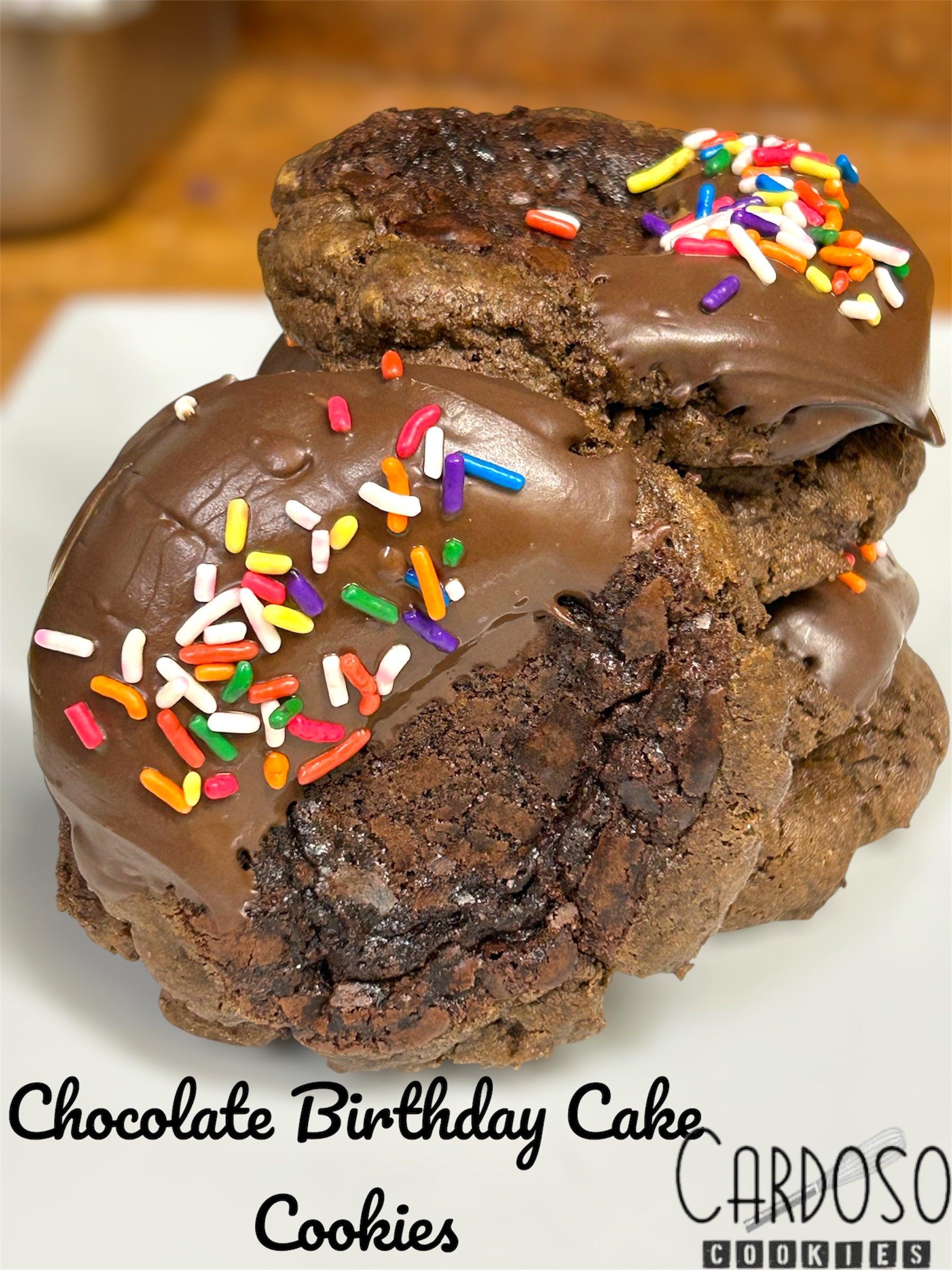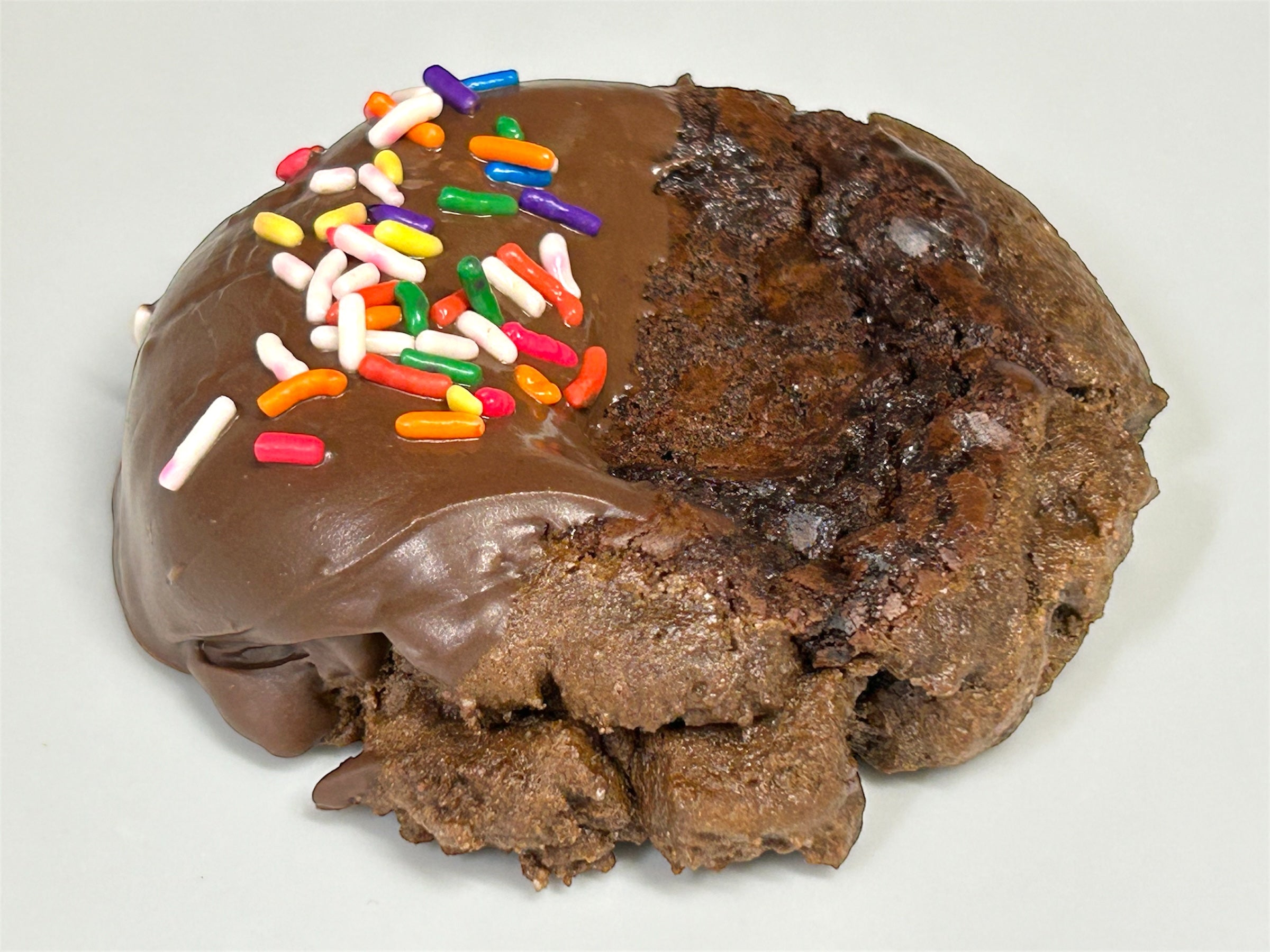 Made with 100% real butter, pure vanilla, Callebaut chocolate. Chocolate cookie filled with chocolate ganache, dipped in dark chocolate, and rainbow sprinkles Ingredients: butter, sugar, light brown sugar, pure vanilla extract, eggs, cake flour, salt, baking soda, chocolate, cocoa powder, rainbow sprinkles