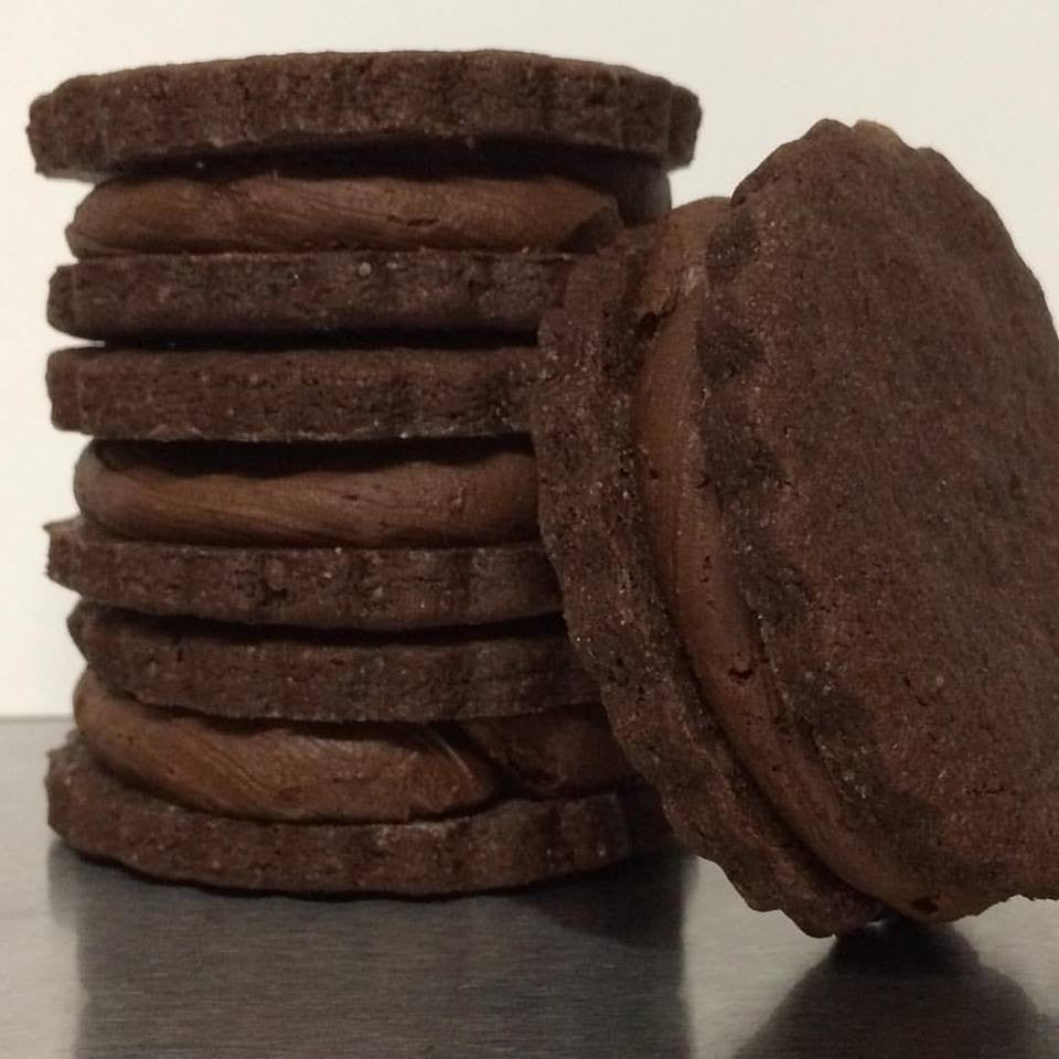 Our Chocolate shortbread cookie filled with scratch made Salted Caramel sauce and whipped Dark Chocolate Ganache Ingredients: butter, sugar, pure vanilla extract, salt, eggs, all purpose flour, cocoa powder, heavy cream, chocolate chips (semi-sweet), salted caramel